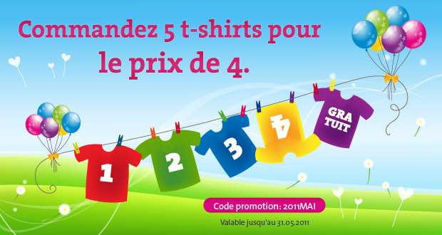 Du 17 au 31 mai, Spreadshirt vous offre l’opportunité de faire le plein de t-shirts personnalisés ! Pour en bénéficier, c’est très simple : créez ou choisissez 5 produits manches courtes (t-shirts ou débardeurs, polos, etc) et utilisez le code promotion 2011MAI avant de payer. Le montant du t-shirt le moins cher sera alors déduit !
