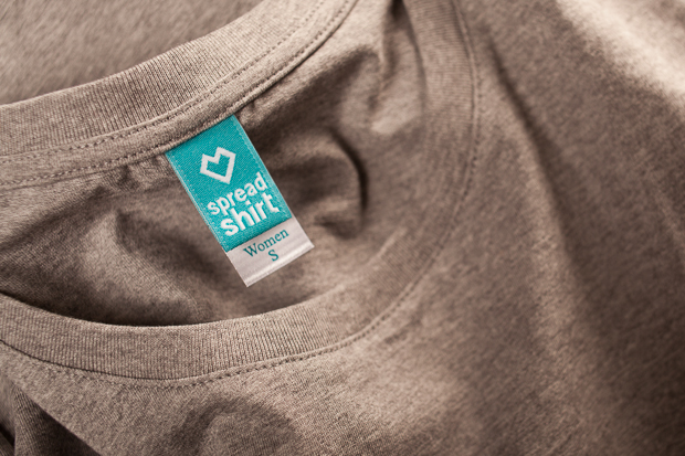 Nous avons décidé de garder l’étiquette Spreadshirt cousue à l’intérieur du col en la modifiant légèrement. Il n’y a plus qu’une seule étiquette tissée qui indique le logo Spreadshirt ainsi que la taille du tee shirt. Toutes les autres indications sont maintenant imprimées sur l’étiquette cousue dans la couture intérieure.