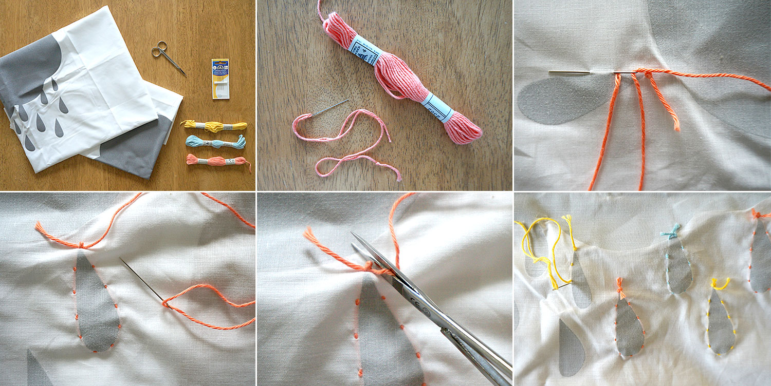 Cristal a choisi pour ce tutoriel des taies d’oreiller Spreadshirt imprimées d’un motif nuage. Et pour ne pas laisser le climat gris envahir votre intérieur, nous vous proposons d’ajouter de la couleur aux gouttes de pluie en les brodant.