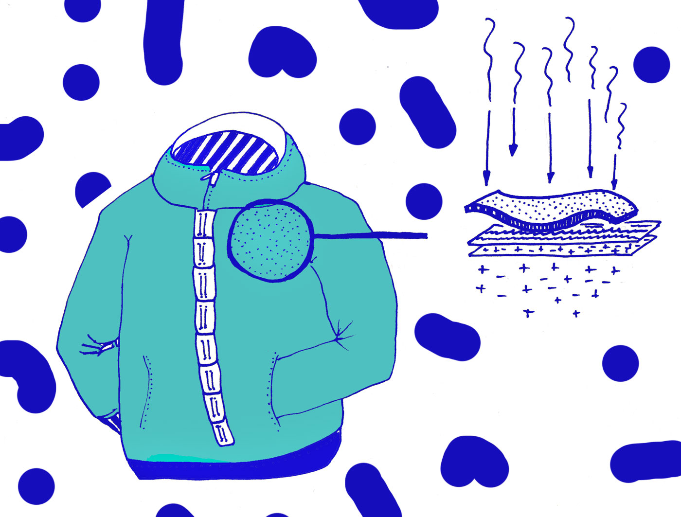 Les crises d’angoisse causées par la recherche de son smartphone sont révolues. En 2045, les moyens de communications sont intégrés aux vêtements. La manche droite fait office de téléphone, la jambe gauche d’écran. Mais le tout peu évidemment être déplacé à sa guise. Et pour éviter les pannes de batterie, l’équipement se recharge à l’énergie solaire.