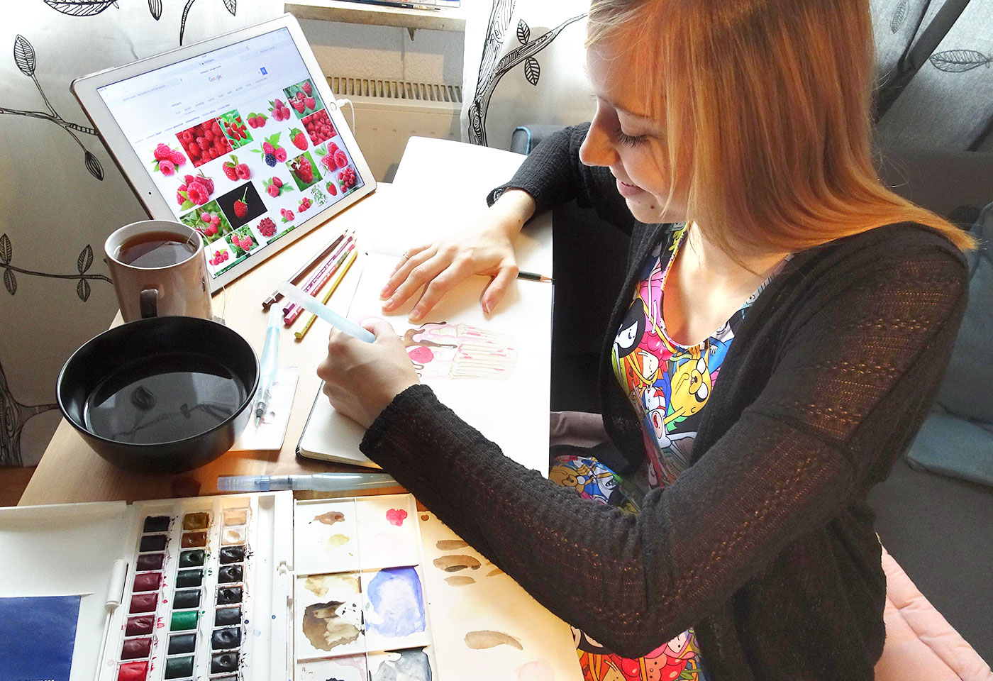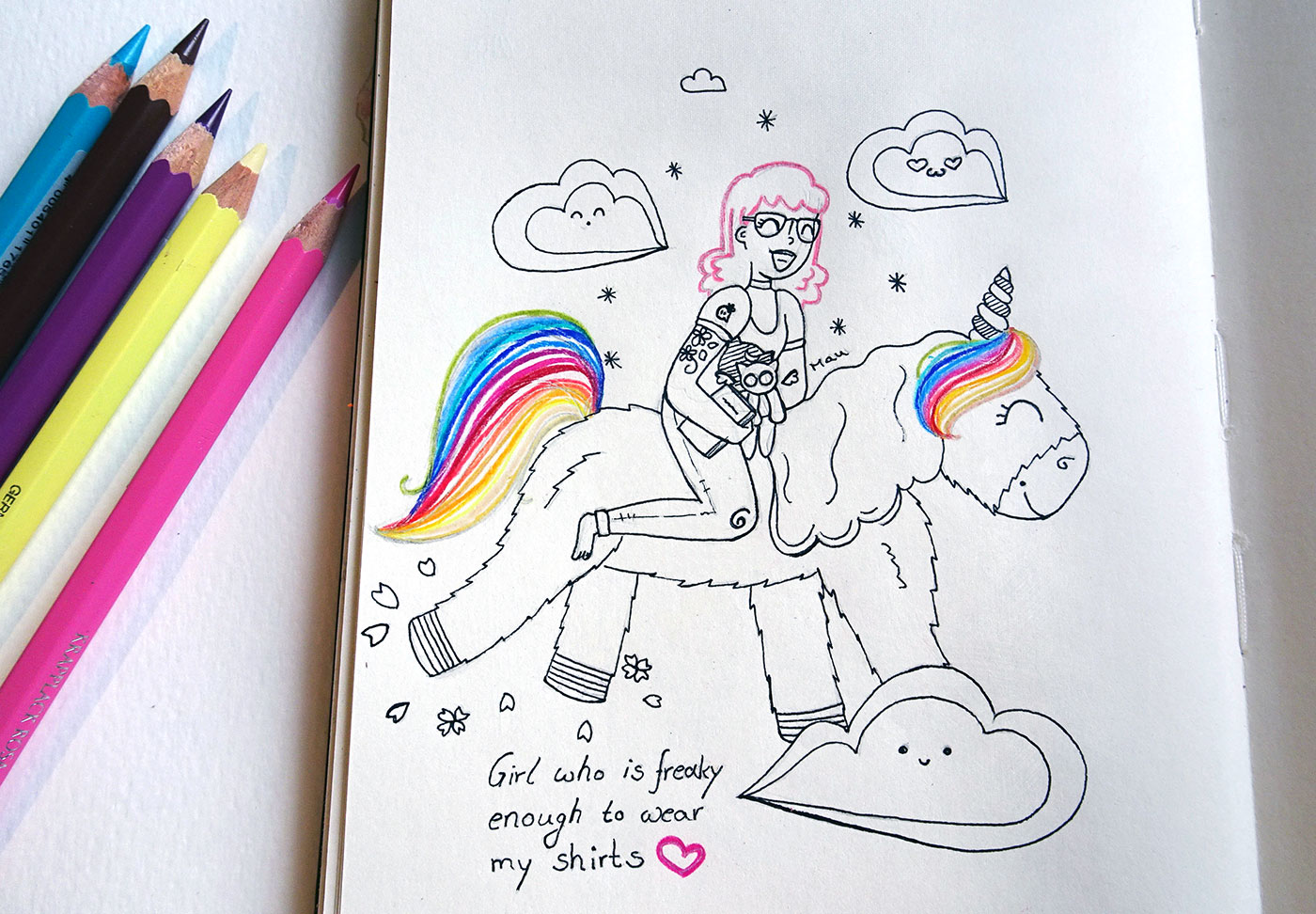 J’aime l’illustration tout comme mon travail. J’attends chaque jour avec impatience la fin de la journée pour m’asseoir avec un pinceau à la main et pouvoir m’attaquer à mes créations. J’imagine souvent comment ça serait de pouvoir en vivre. Aujourd‘hui grâce aux plateformes comme Spreadshirt ou DaWanda, Etsy et YouTube, il existe de nombreuses possibilités pour se trouver soi-même et gagner de l’argent.