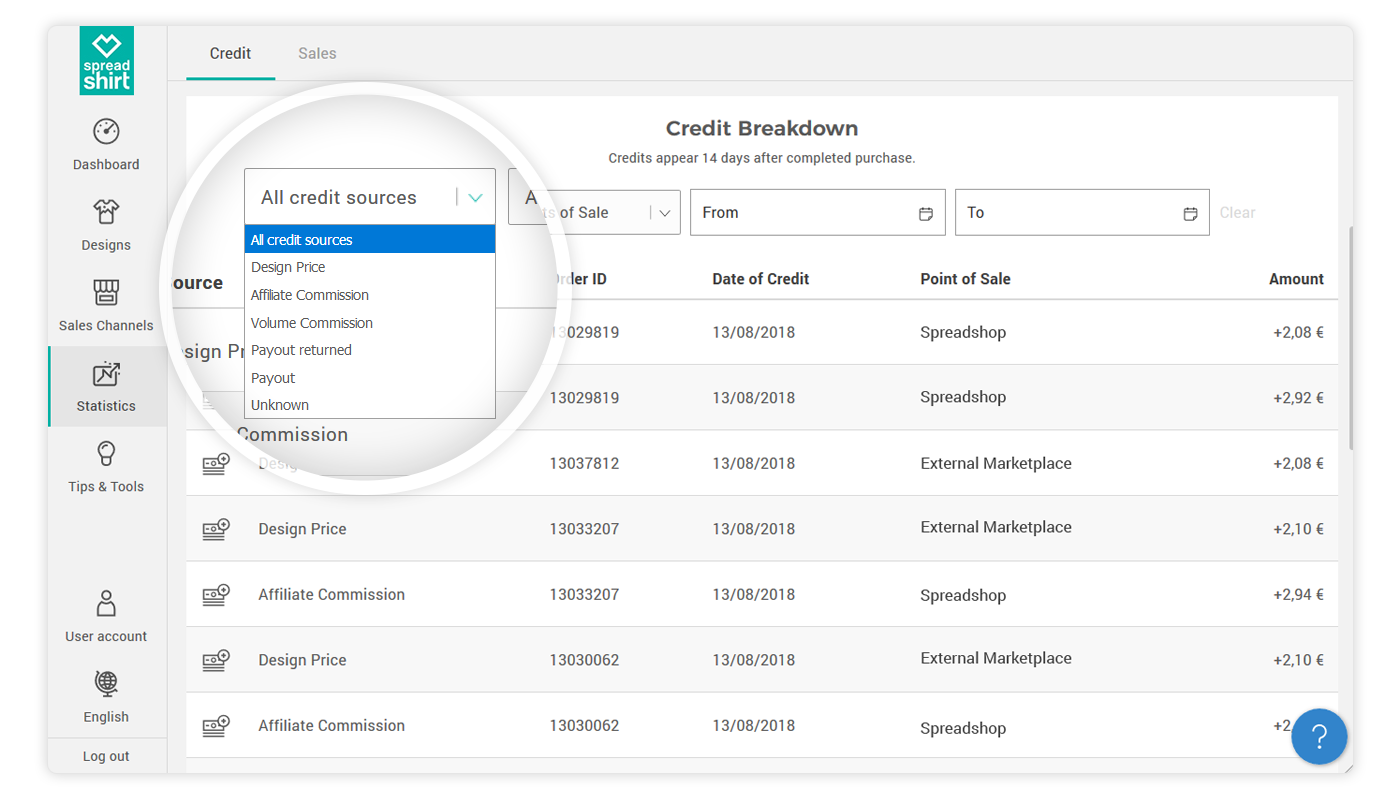 Des filtres dans le menu « Avoir » ont été ajoutés. Vous êtes maintenant en mesure de filtrer vos gains en fonction de la date du versement, du prix du design, de la commission sur les ventes générées et du bonus sur les ventes.